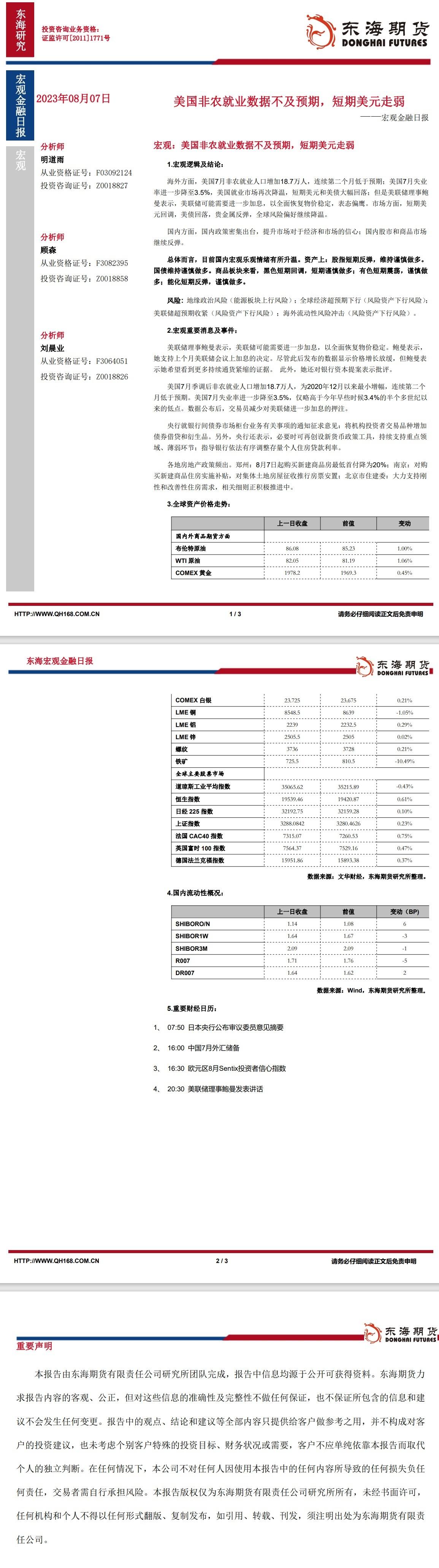 标题:【东海期货8月7日宏观金融日报】:美国非农就业数据不及预期,短期美元走弱