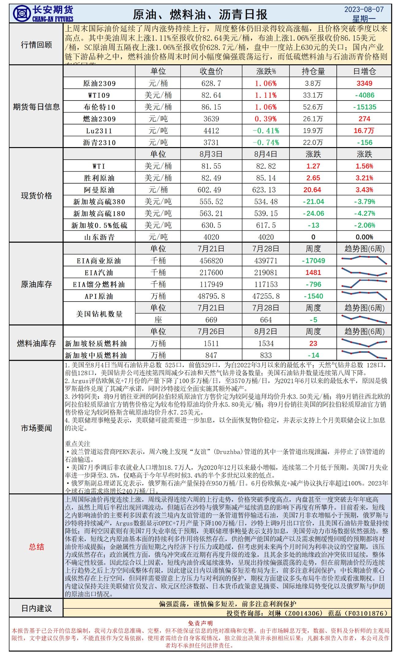 标题:长安期货8月7日原油早评:基本面强势油价连续上行,偏强运行之际注意前多利润保护