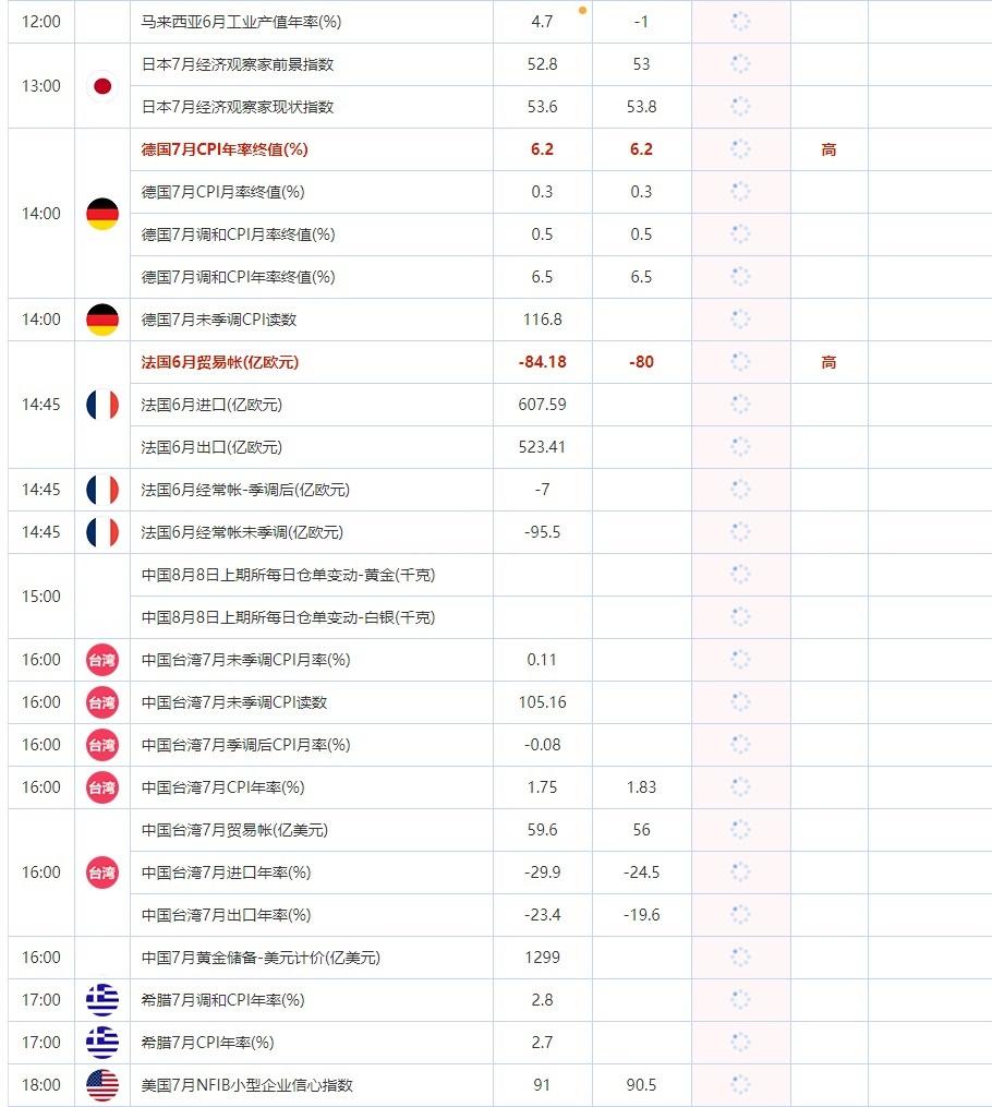 14:00 德国7月调和CPI年率终值(%) , 前值 6.5 , 预期值 6.5 , 公布值:待发布