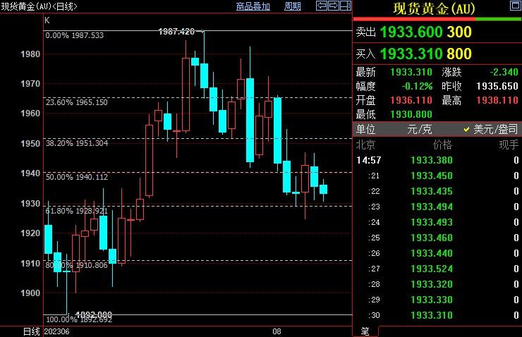 北京时间19:34,现货黄金下跌0.28%至1930.90美元/盎司;COMEX期金主力合约下跌0.24%至1965.3美元/盎司;美元指数上涨0.57%至102.657。