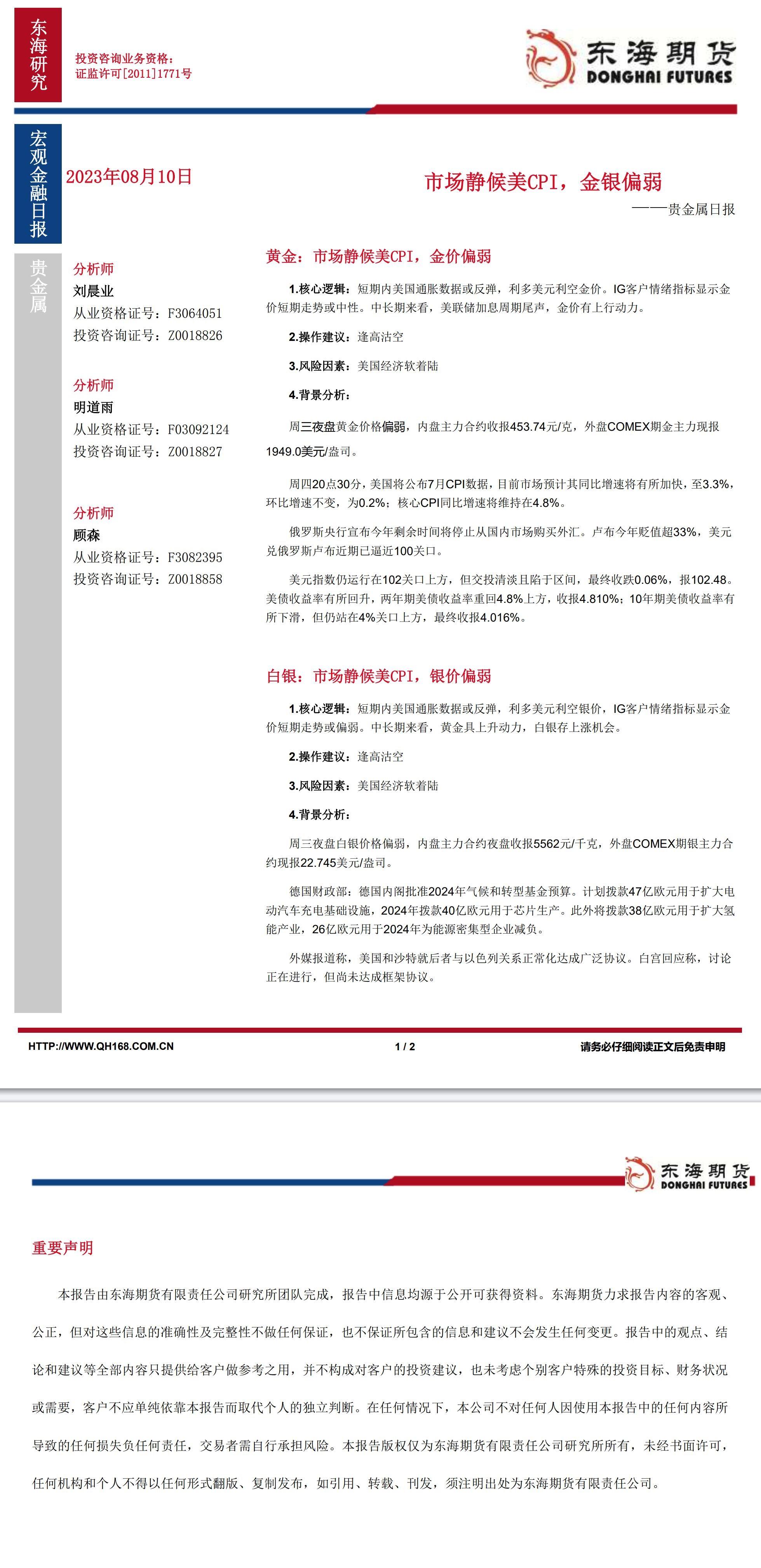 标题:【东海期货8月10日产业链日报】贵金属篇:市场静候美CPI,金银偏弱