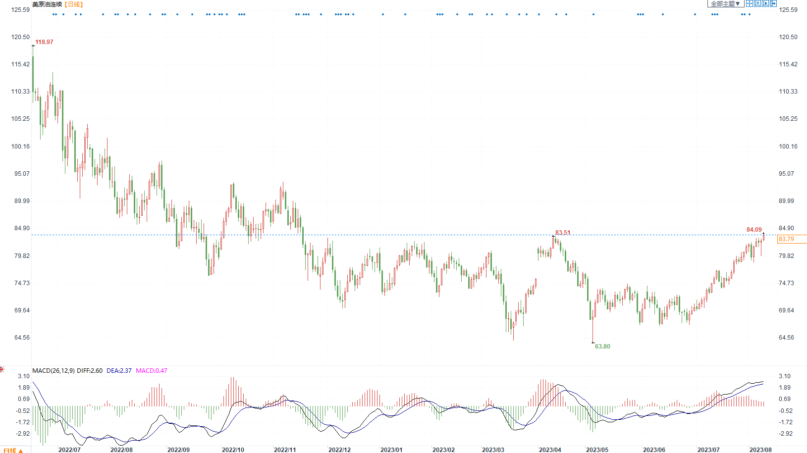 周三国内原油价格继续上涨。上周欧佩克及其减产同盟国联合部长监测委员会没有做出进一步减产举措,但是支持沙特等国自愿额外减产延长到9月份的决定。通用电气公司的油田服务机构贝克休斯公布的数据显示,截至8月4日的一周,美国在线钻探油井数量525座,比前周减少4座;比去年同期减少73座。尽管中国原油进出口数据对市场利空,但是美国能源信息署预测经济前景乐观。中国海关数据显示,7月份我国原油进口量4124.3万吨,比5月份进口量减少近20%;成品油进口量252.3万吨,比5月份减少45%。美国能源信息署在刚刚公布的8月份《短缺能源展望》中预计,2023年美国国内生产总值(GDP)将增长1.9%,高于此前预测的1.5%,随后国际油价逆转跌势而上涨。美国石油学会数据显示,上周美国原油库存增加、馏分油库存和汽油库存减少。截至8月4日当周,美国商业原油库存增加约410万桶,汽油库存减少约41.3万桶,馏分油库存减少约210万桶。技术面,油价后市仍然维持谨慎看涨。操作建议:震荡偏多。