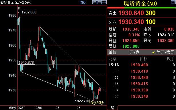 北京时间19:39,现货黄金下跌0.01%至1924.92美元/盎司;COMEX期金主力合约下跌0.06%至1958.8美元/盎司;美元指数下跌0.10%至102.444。
