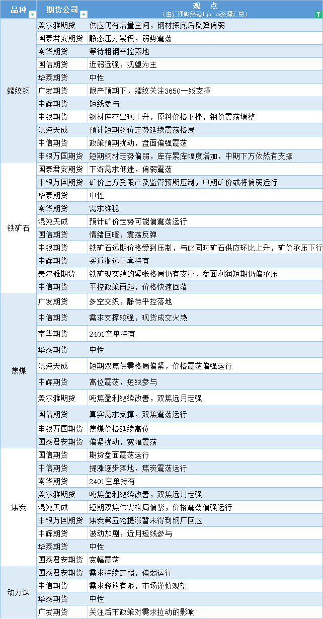 汇通财经APP讯——期货公司观点汇总一张图:8月11日黑色系(螺纹钢、焦煤、焦炭、铁矿石、动力煤等)
