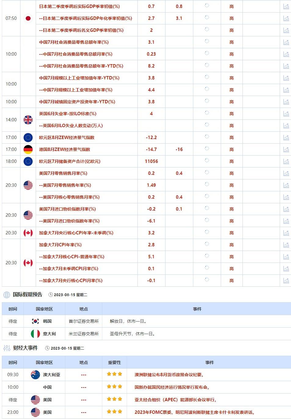 ②8月15日(周二)关键字:欧元区8月ZEW经济景气指数,澳洲联储货币政策会议纪要