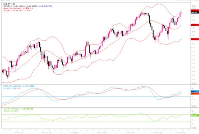 周四(8月10日)美元兑日元一度触及五周最高的144.81圆,盘尾报144.75,上涨0.72%。隔夜美国公布的7月份通胀数据CPI,打消了市场希望美联储将停止加息的期盼,继续巩固了9月份将会加息25个基点的预期。为此,美元兑日元得以继续攀高,一度逼近年内高点145。息差进一步有望拉大,美元/日元将会在套利交易的继续驱动下,有望进一步向更高水位测试。当然了,去年当汇价去到145-146价位附近时,日本央行曾首次出手干预过。预料当汇价逼近上述水平时,交投将会变得谨慎。日线图上,美元/日元沿着各短期均线继续向上攀爬,技术指标配合性地继续上扬,显示美元多头力量占优。短线需留意145阻力水平的争夺,若突破之,美元/日元将有望加快步伐攀升更高一线。但要注意日本央行是否有干预的举动。