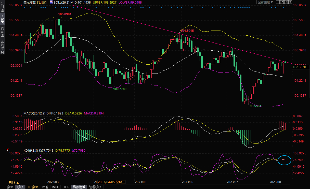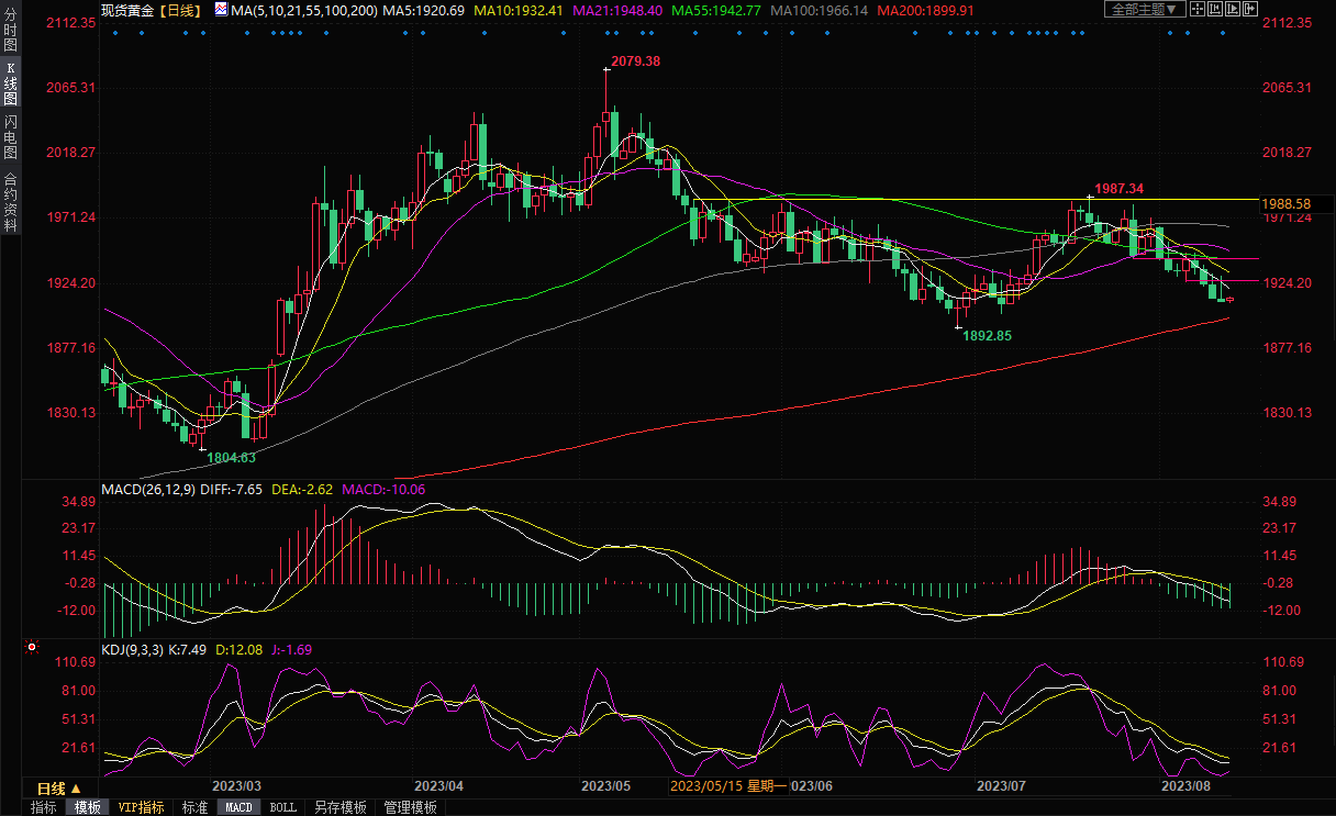 相对而言,技术面来看,金价短线仍有进一步下探风险,关注布林线下轨1907附近支撑,随着美联储加息周期即将结束的预期强化,预计金价的短线下行空间将受到限制,200日均线支撑目前正好在1900关口附近,在跌破该位置前,需要提防多头重拾涨势的可能性。