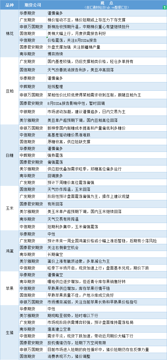 汇通财经APP讯——期货公司观点汇总一张图:8月14日农产品(棉花、豆粕、白糖、玉米、鸡蛋、生猪等)
