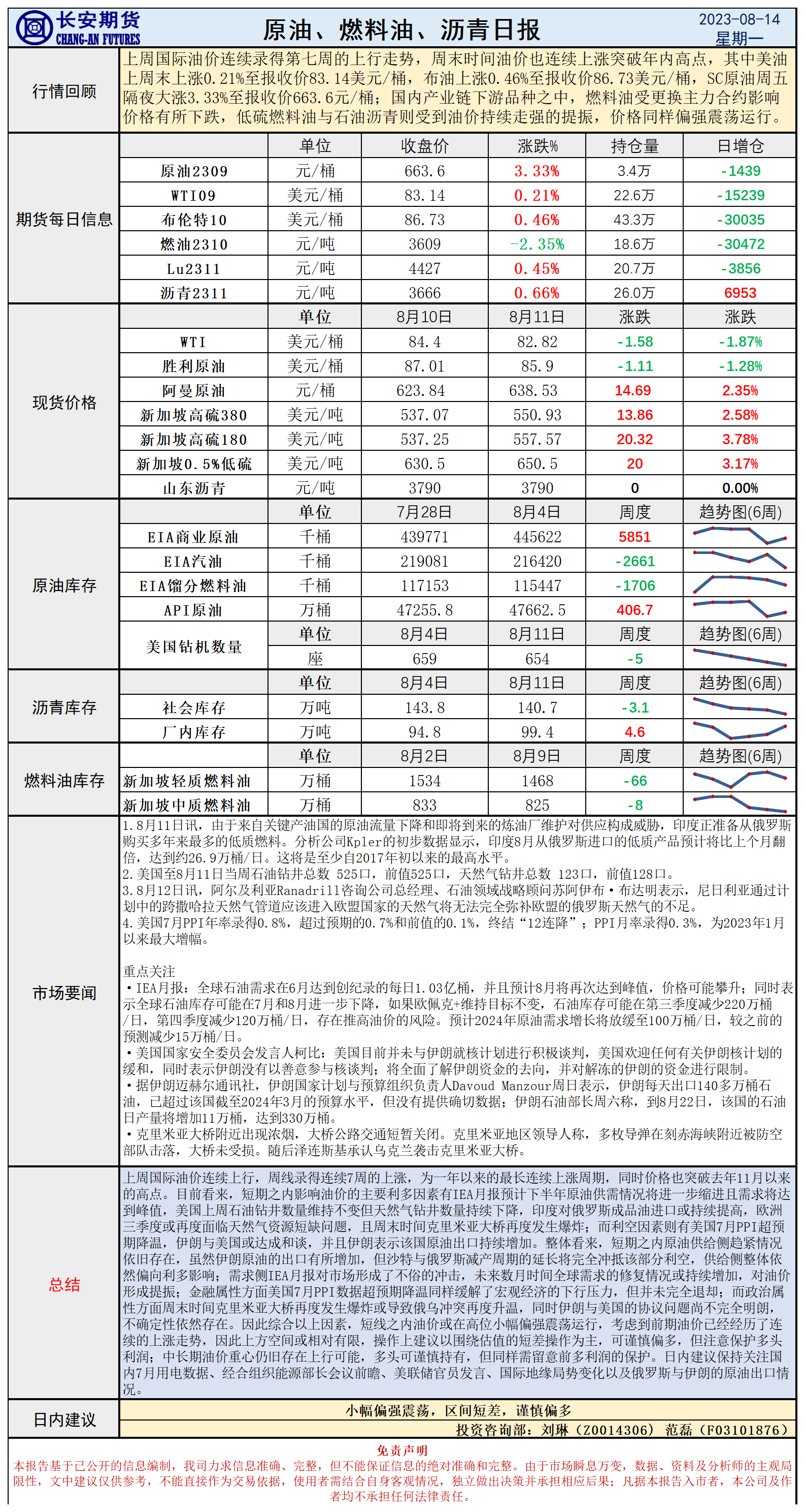 标题:长安期货8月14日原油早评:IEA月报强势提振价格,连续上行后油价上方空间或有限