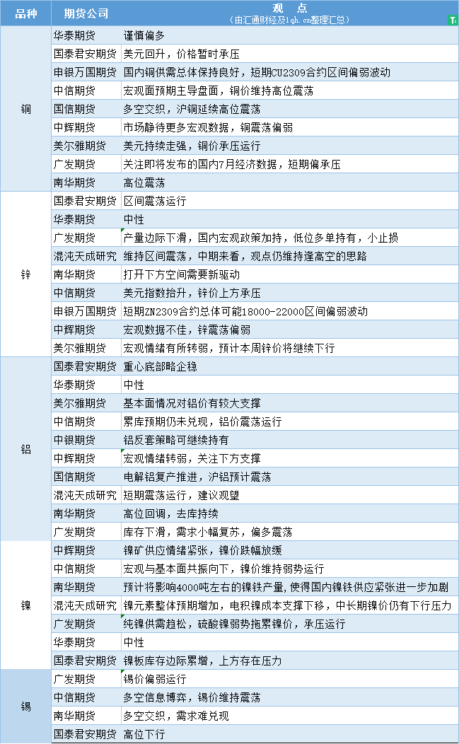 汇通财经APP讯——期货公司观点汇总一张图:8月15日有色系(铜、锌、铝、镍、锡等)