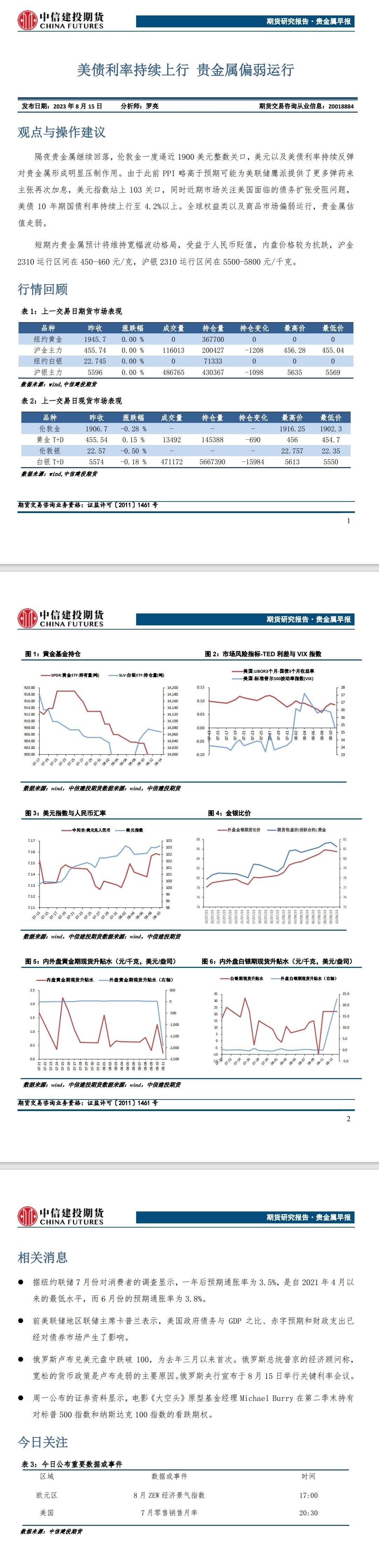 标题:中信建投期货8月15日贵金属早报:美债利率持续上行 贵金属偏弱运行