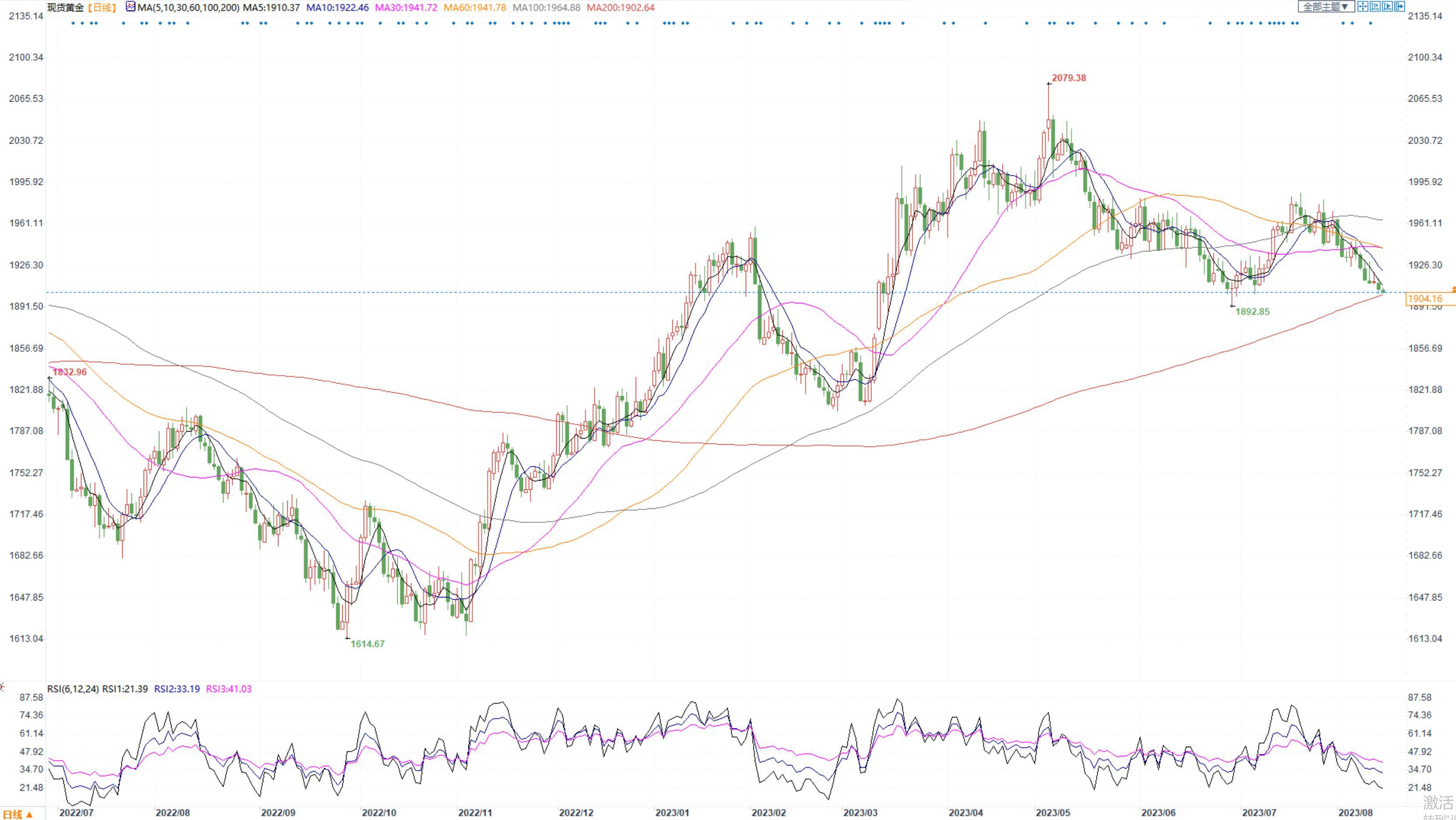 周一,截至北京时间15:00,美元指数回涨。美国财政部超预期发债造成了流动性压力,美元指数、美国国债收益率均上涨,对贵金属起到一定的打压力量。此外,美国7月PPI同比上涨0.8%、高于市场预期增长0.7%,环比上涨0.3%、为一月份以来的最大增幅。PPI的超预期叠加美联储官员近期较为鹰派的发言使得市场对加息的预期有所反复,金银目前陷入震荡走势。展望后市,美国通胀有所放缓,软着陆预期增强,短期内预计贵金属价格或以震荡为主,操作建议短线思路。