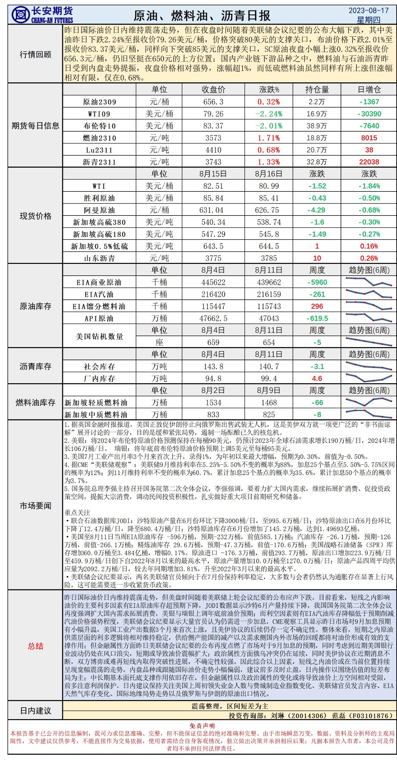 标题:长安期货8月17日原油日报:会议纪要重燃加息预期,供需博弈油价或宽幅震荡