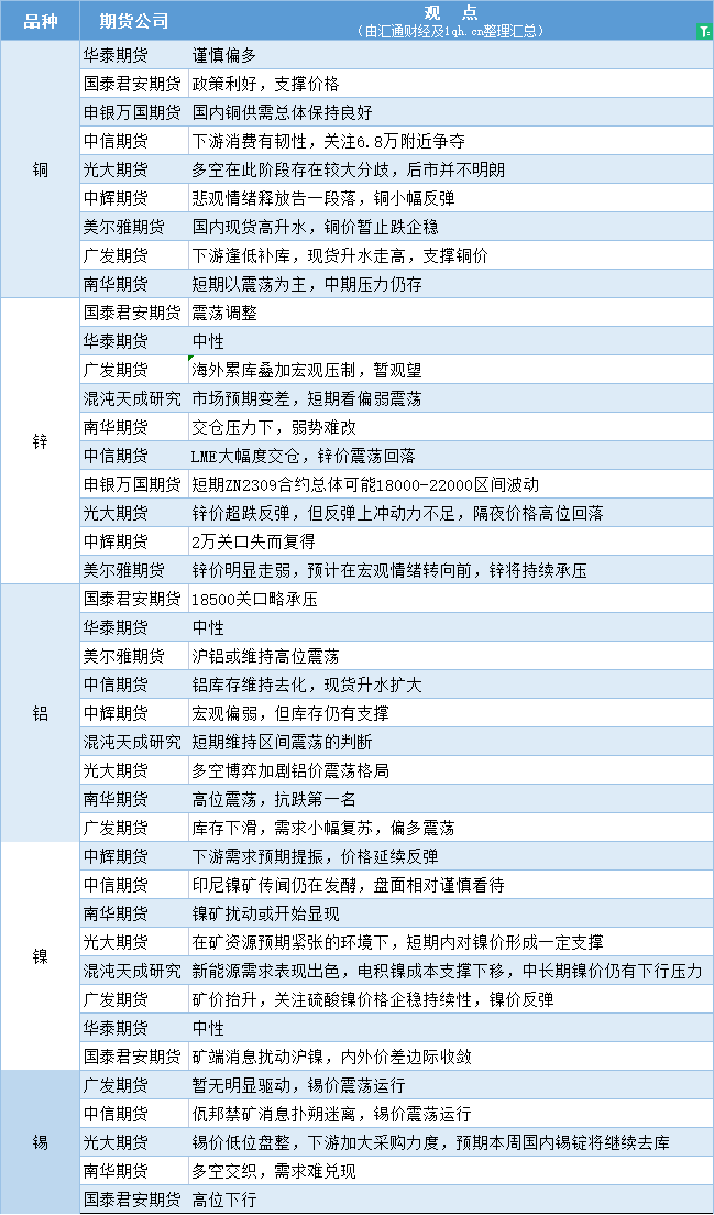 汇通财经APP讯——期货公司观点汇总一张图:8月18日有色系(铜、锌、铝、镍、锡等)