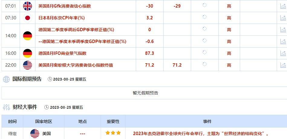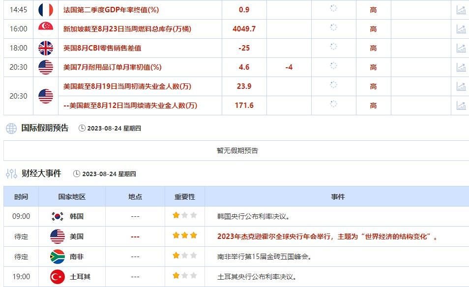 8月24日,2023年杰克逊霍尔全球央行年会举行,主题为“世界经济的结构变化”。投资者需要关注各位官员的讲话,可能对未来政策制定或市场走势造成影响。