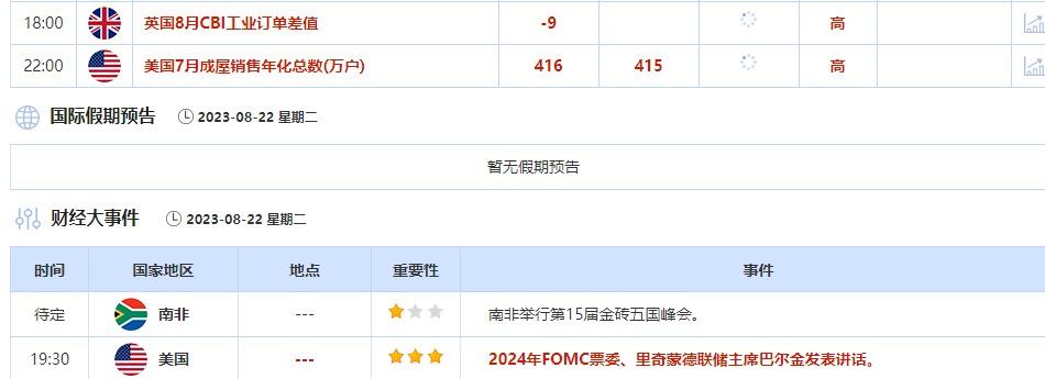 ②8月22日(周二)关键字:美国7月成屋销售年化总数,里奇蒙德联储主席巴尔金