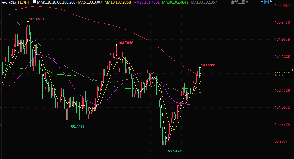 美元指数日内上涨0.097%,报103.56点,此前曾触及两个月高点103.59。近期一系列美国经济数据强化了利率将在一段时间内保持高位的观点,为美元提供了支撑。