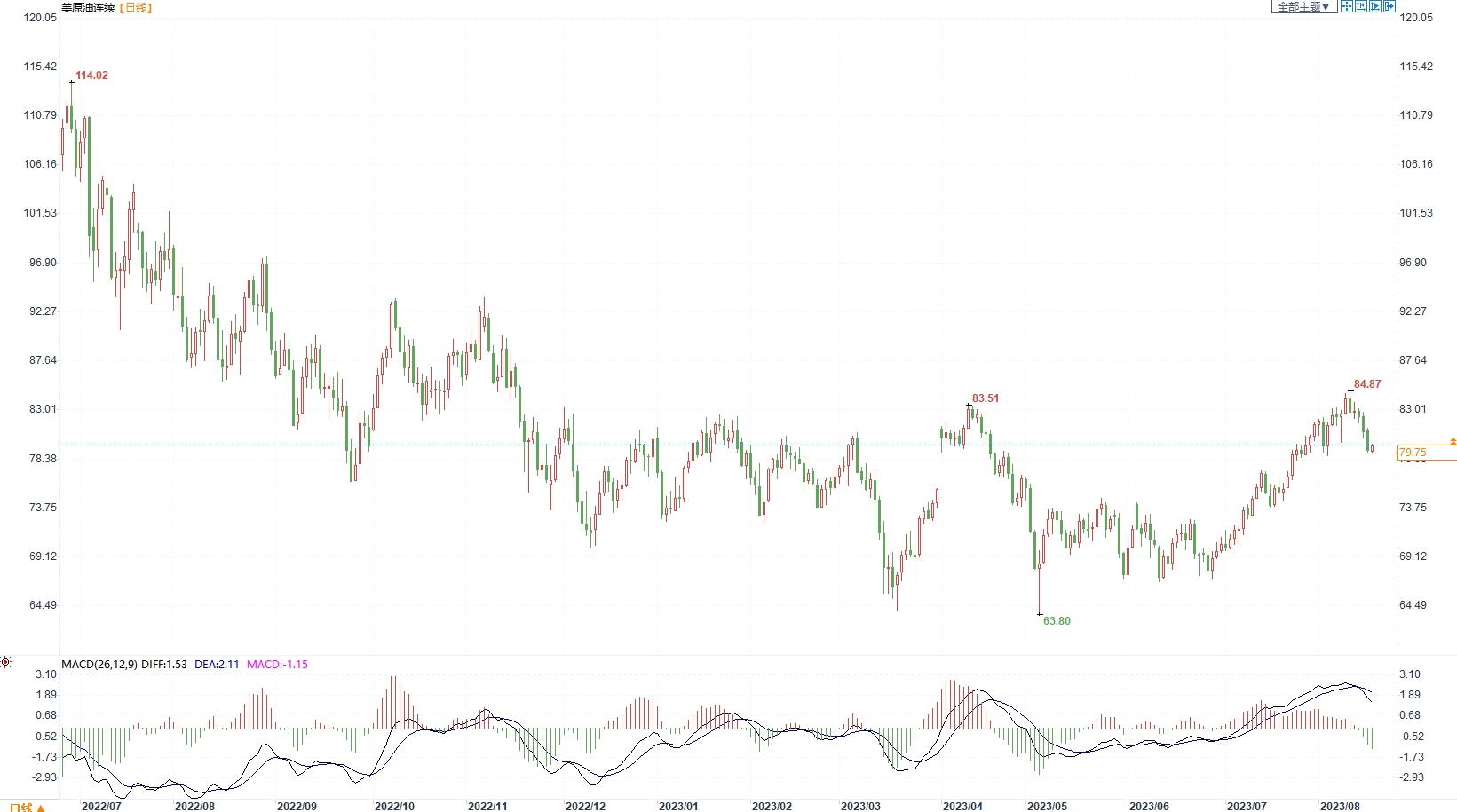 周四国内原油价格小幅震荡回调。中国海关数据显示,7月份我国原油进口量4124.3万吨,比5月份进口量减少近20%;成品油进口量252.3万吨,比5月份减少45%。今年1-7月份中国原油进口量30183万吨,比去年同期减少5.6%;1-7月份成品油进口量1872.8万吨,比去年同期减少19.7%。对需求悲观抵消了供应紧缺的影响,美国基准原油期货连续三天累计下跌了4.6%。美国汽油需求和馏分油需求减少,反映了夏季旅行高峰季节已经接近尾声。美国能源信息署数据显示,截至2023年8月11日当周,包括战略储备在内的美国原油库存总量7.88016亿桶,比前一周下降536万桶;美国商业原油库存量4.39662亿桶,比前一周下降596万桶;美国汽油库存总量2.16158亿桶,比前一周下降26.1万桶;馏分油库存量为1.15743亿桶,比前一周增长29.6万桶。备受关注的美国俄克拉荷马州库欣地区原油库存3380.2万桶,减少83.7万桶。过去的一周,美国石油战略储备3.48354亿桶,增加了60万桶。美国原油产量增加至疫情前水平。截至8月11日当周,截至8月12日当周,美国原油日均产量1270万桶,比前周日均产量增加10万桶,比去年同期日均产量增加60万桶。技术面,油价已经透支了未来上涨空间,短期维持高位震荡调整。操作建议:震荡偏空。