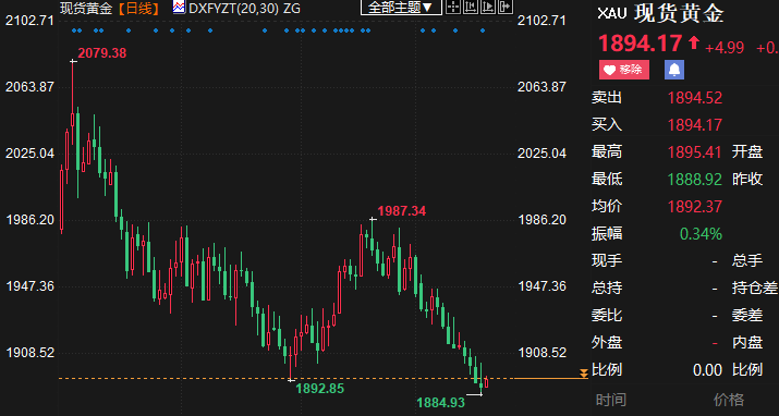 汇通财经APP讯——由于担心美联储将在更长时间内维持较高利率水平,现货黄金价格盘中跌创3月13日以来新低至1884.93美元/盎司,几乎铁定将连续第四周下跌。截至发稿,现货黄金下跌1.02%至1894.16美元/盎司。