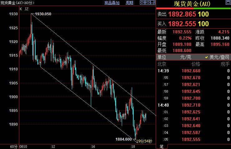 北京时间14:42,现货黄金上浮0.18%至1892.52美元/盎司;COMEX期金主力合约上浮0.34%至1921.6美元/盎司;美元指数下跌0.06%至103.363。