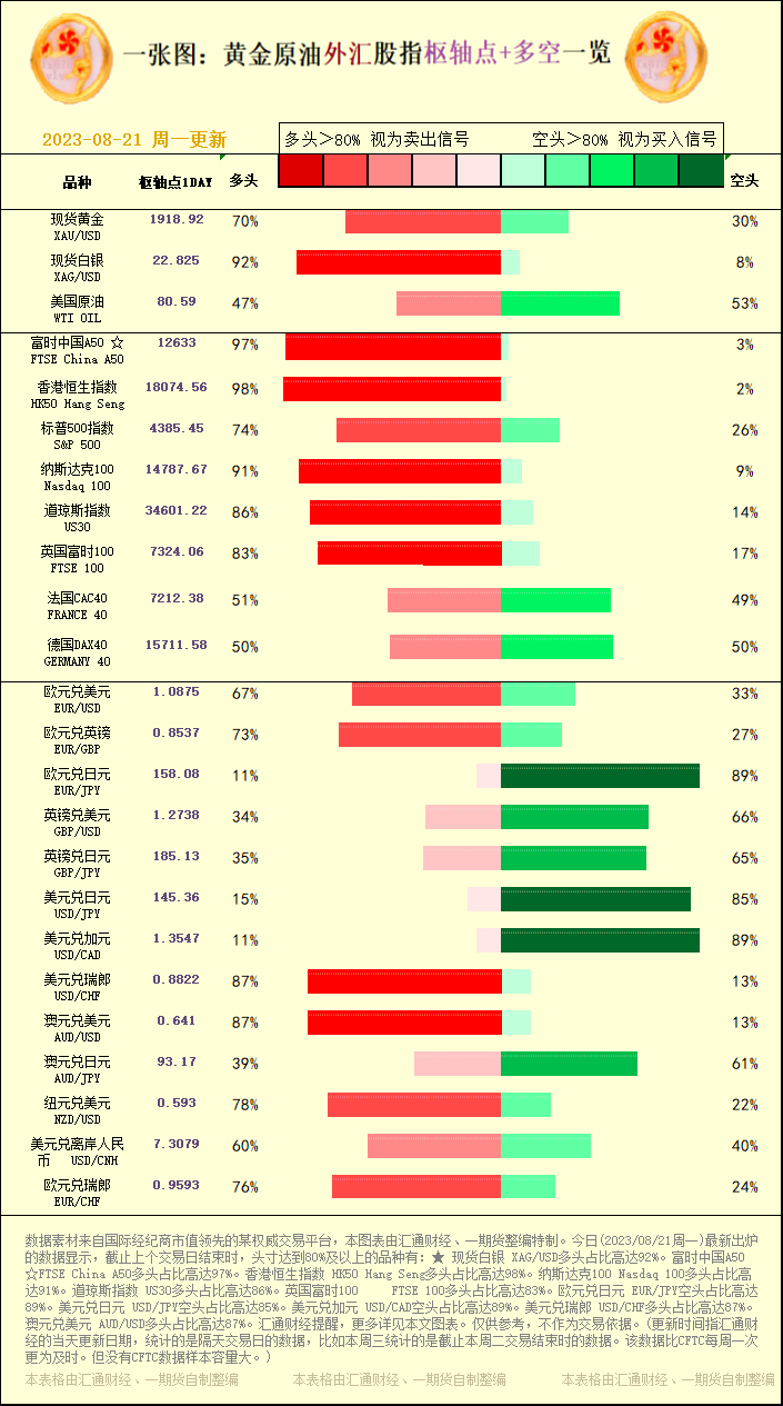 标题:一张图:2023/08/21黄金原油外汇股指"枢纽点+多空占比"一览