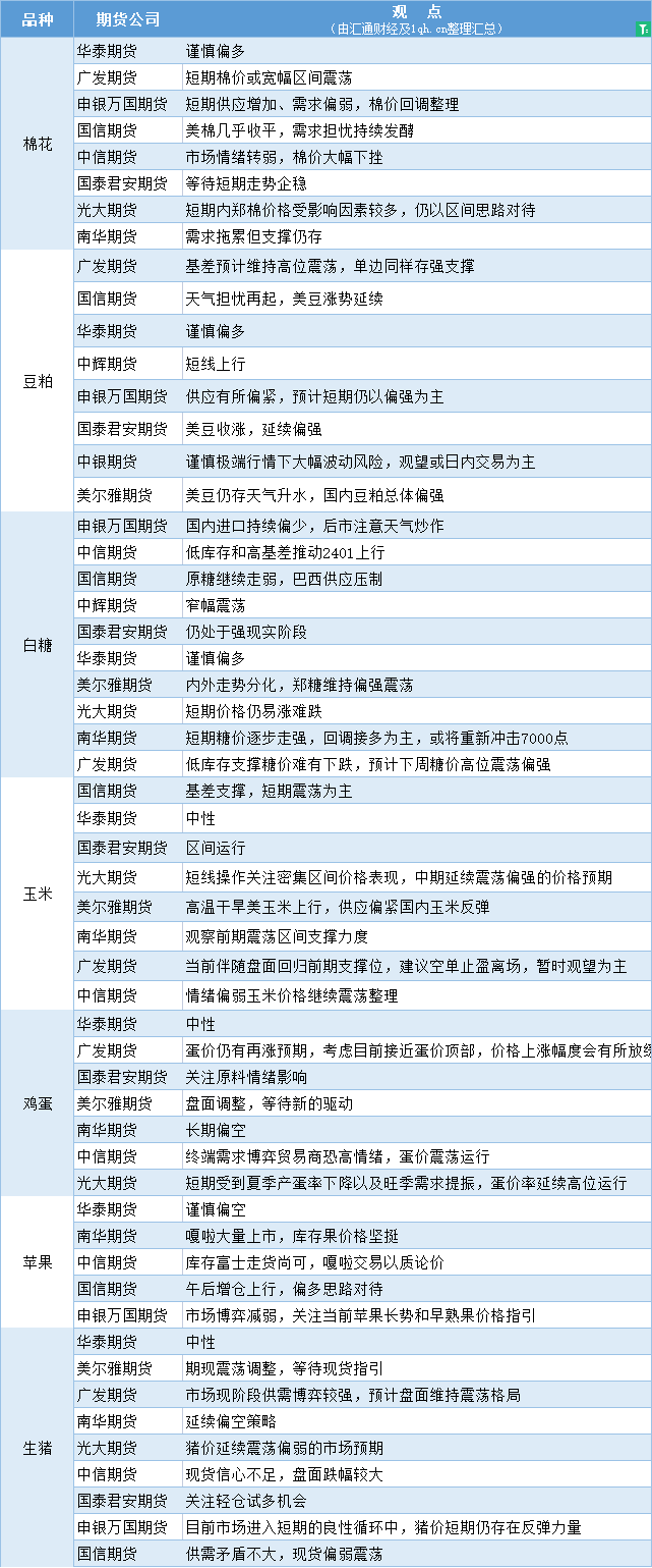 汇通财经APP讯——期货公司观点汇总一张图:8月21日农产品(棉花、豆粕、白糖、玉米、鸡蛋、生猪等)