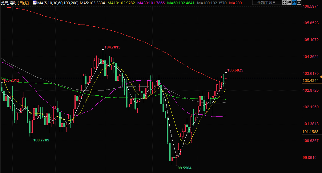 美元指数下跌0.01%,报103.380点,稍早触及两个月新高103.680点。本周美元将上涨0.5%。Convera高级市场分析师Joe Manimbo说,“美元继续保持涨势,由于美国经济表现远好于预期,这导致市场推后了美联储可能放宽政策的时间框架。”