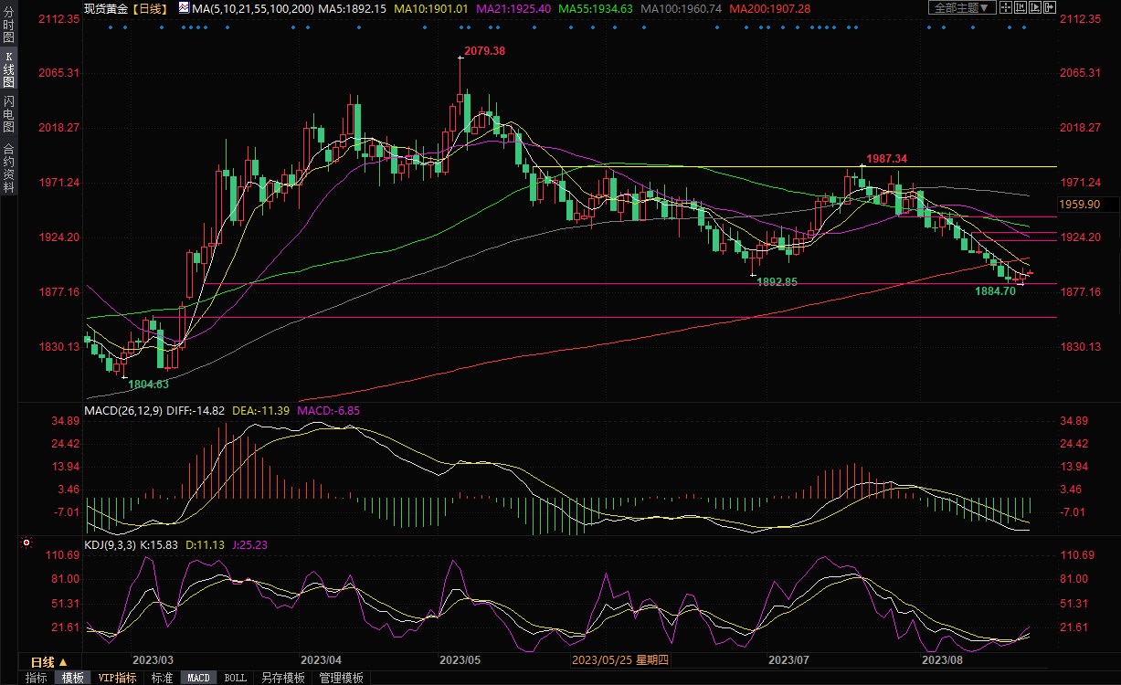 整体来看,金价的短线下跌动能有所减弱,短线空单获利了结和逢低买盘有望给金价提供一些短线反弹机会,分别关注1900关口和200日均线1907.28附近阻力;但在本周五鲍威尔讲话前,金价反弹空间或将受到限制;由于市场提升了美联储年内再加息一次的预期,如果美联储官员发表鹰派讲话,则需要提防金价的进一步下行风险,短线关注1880-1885区域支撑。北京时间09:55,