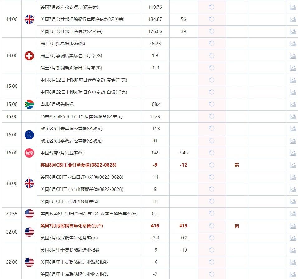 22:00 美国7月成屋销售年化月率(%) , 前值 -3.3 , 预期值 -0.2 , 公布值:待发布