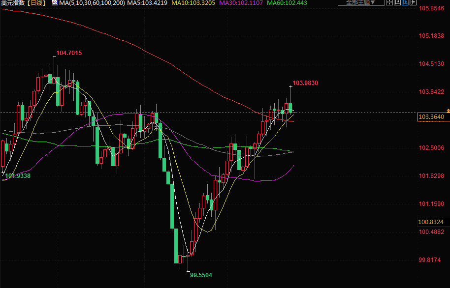 该指数盘初触及两个多月高点103.98,此前欧洲公布的企业活动数据令人沮丧,给欧元和英镑带来压力。