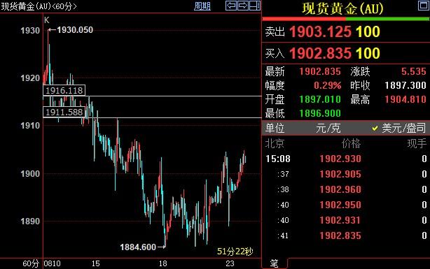 北京时间20:06,现货黄金上涨0.35%至1903.81美元/盎司;COMEX期金主力合约上涨0.34%至1932.5美元/盎司;美元指数上涨0.31%至103.916。