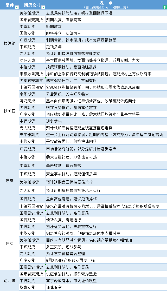 汇通财经APP讯——期货公司观点汇总一张图:8月28日黑色系(螺纹钢、焦煤、焦炭、铁矿石、动力煤等)