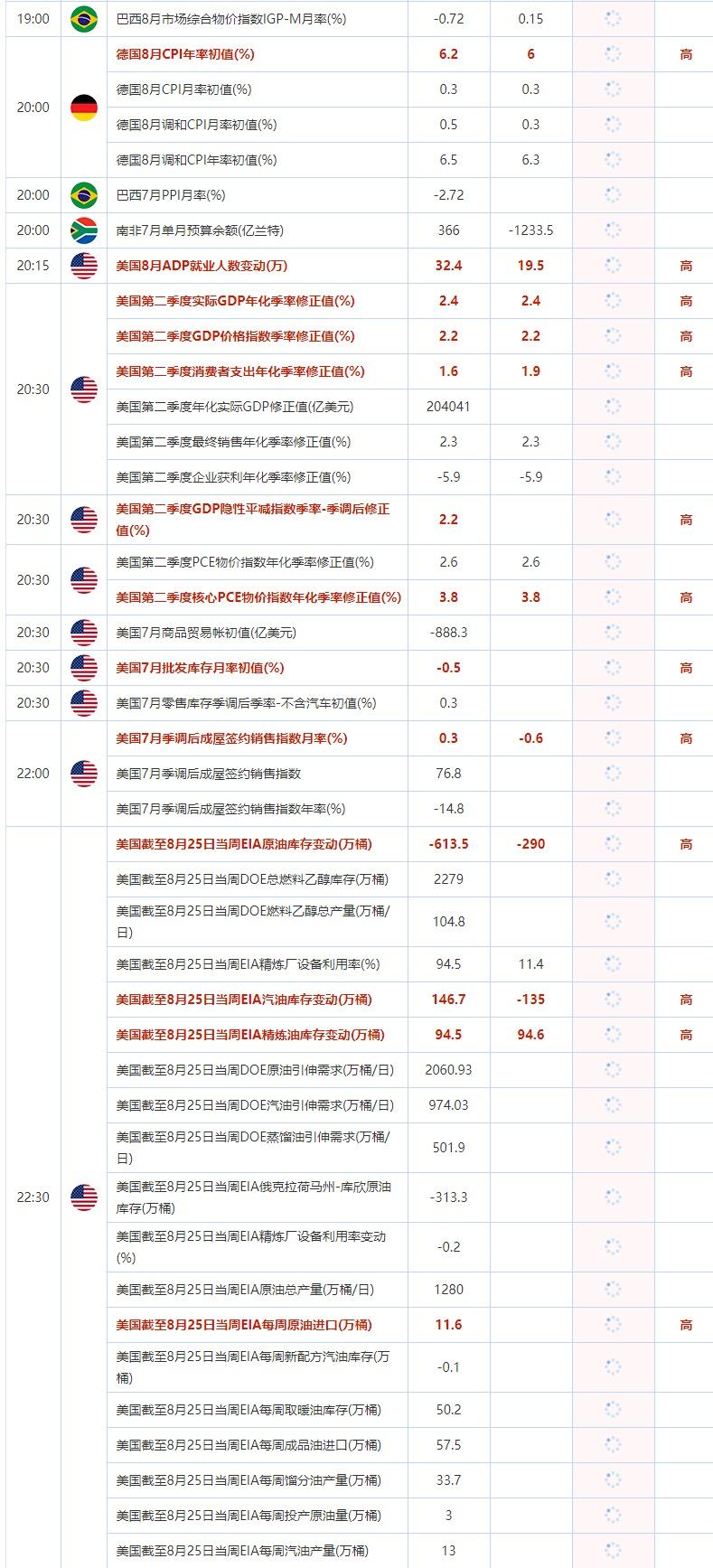 20:30 美国第二季度实际GDP年化季率修正值(%) , 前值 2.4 , 预期值 2.4 , 公布值:待发布