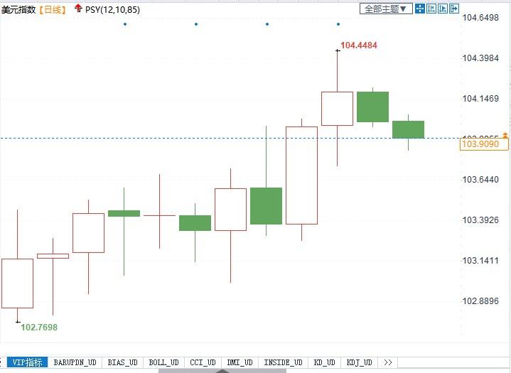 上周,美元指数一度触及近6个月的最高水平104.45,之后略有回落,目前交投于103.93附近。