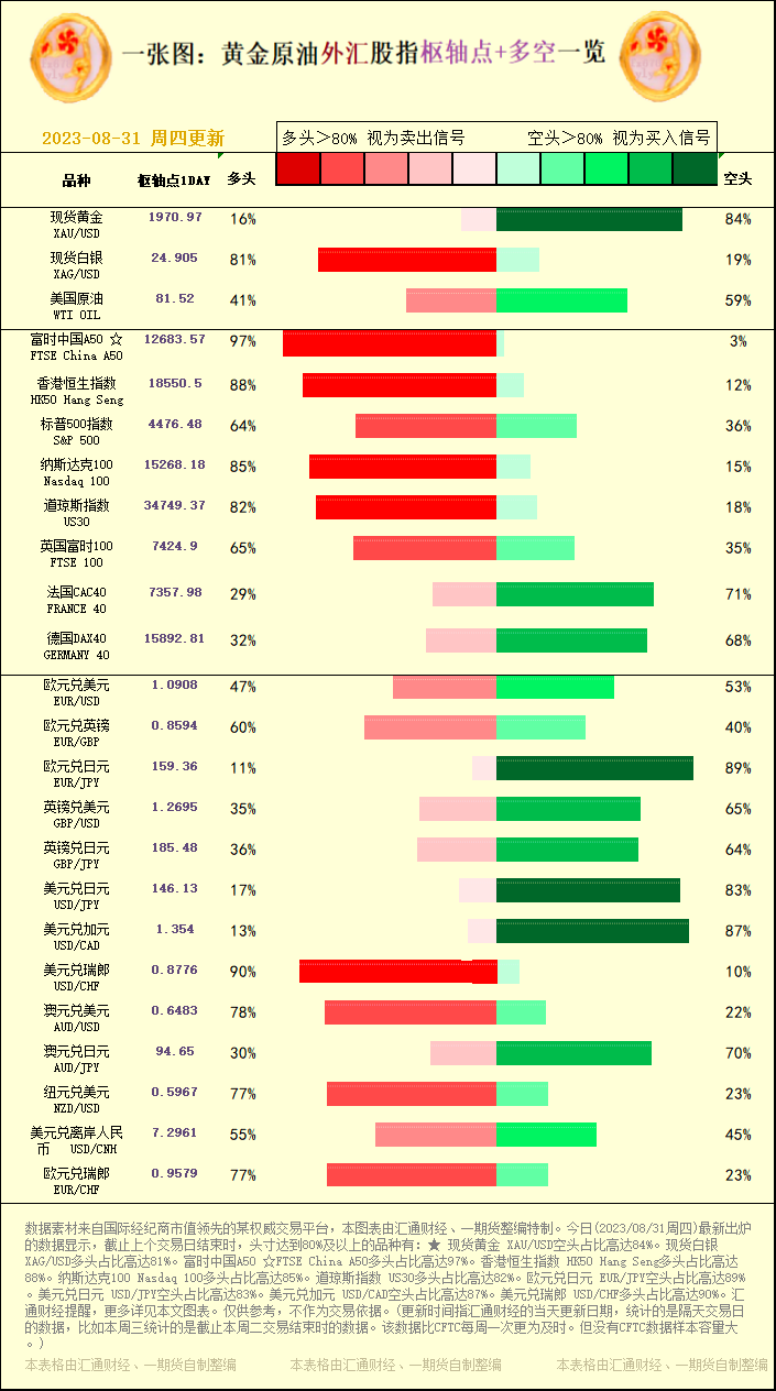 标题:一张图:2023/08/31黄金原油外汇股指"枢纽点+多空占比"一览