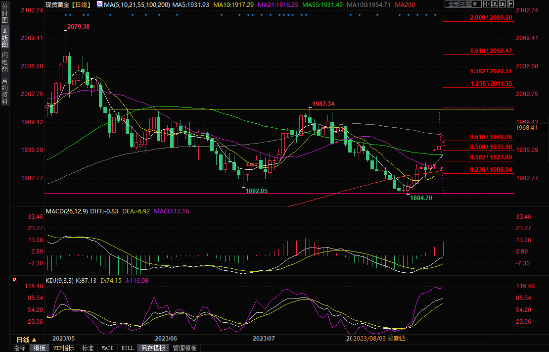 技术面来看,日线级别,MACD金叉运行,KDJ金叉运行,金价顶破55日均线后延续涨势,短线偏向多头,有望进一步试探100日均线1954.71附近阻力,甚至是布林线上轨1966.25附近阻力。