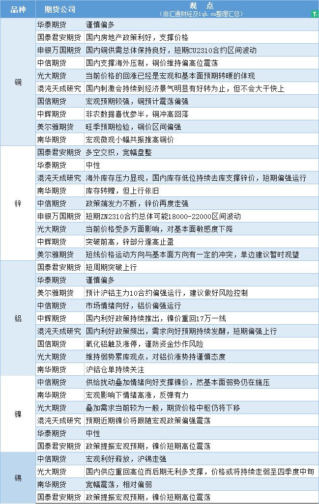 汇通财经APP讯——期货公司观点汇总一张图:9月4日有色系(铜、锌、铝、镍、锡等)