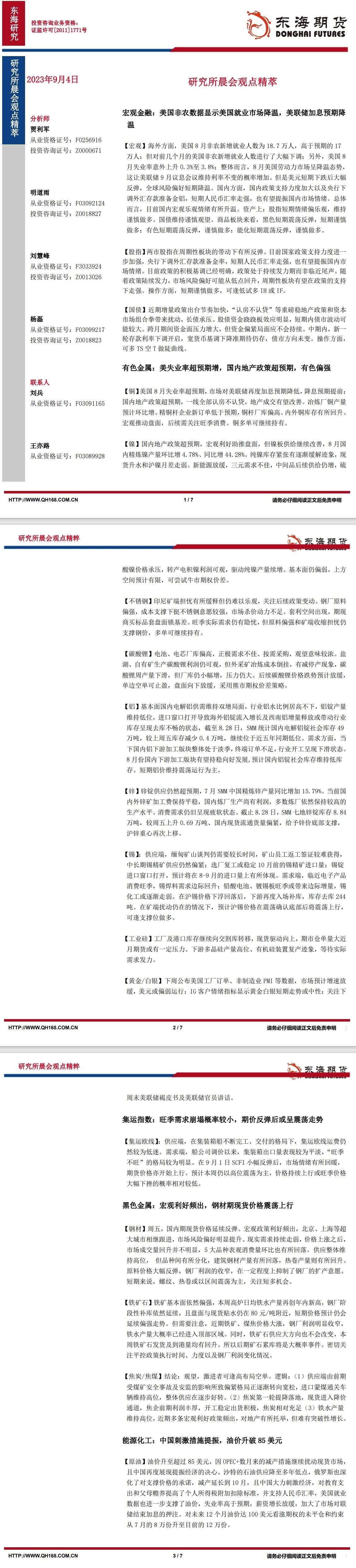标题:【东海期货9月4日研究所晨会观点精萃】美国非农数据显示美国就业市场降温,美联储加息预期降温