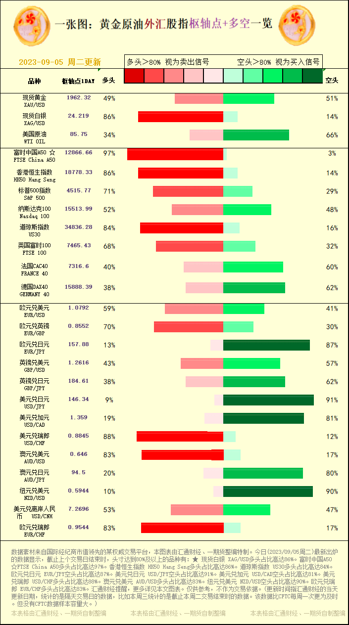 标题:一张图:2023/09/05黄金原油外汇股指"枢纽点+多空占比"一览
