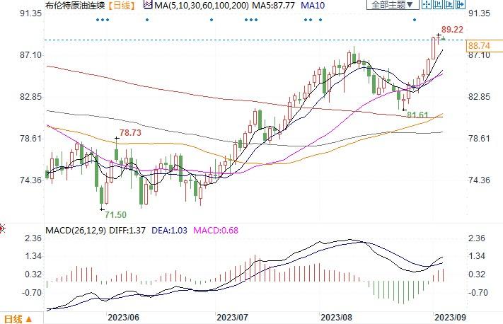 北京时间9月5日11:07 布伦特原油主力合约现报 88.92 美元/桶