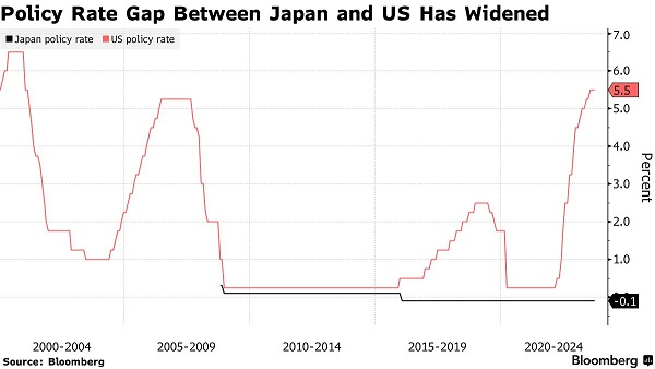 自2016年以来,日本央行的政策利率一直保持在-0.1%,而美国的政策利率目前已经升至5.5%。