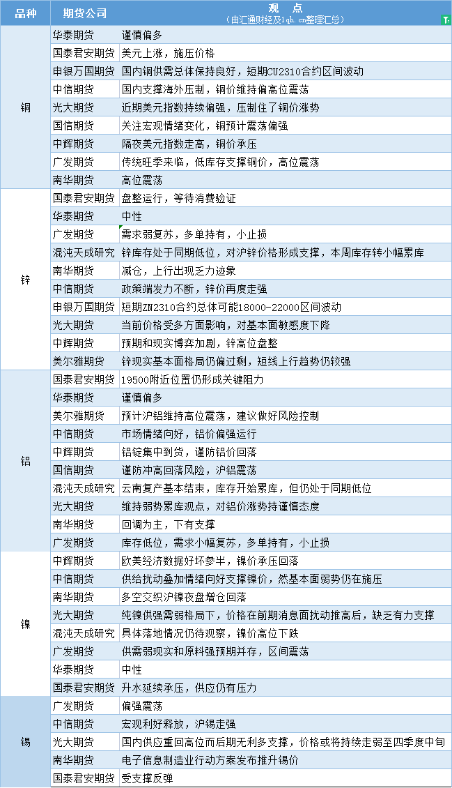 汇通财经APP讯——期货公司观点汇总一张图:9月7日有色系(铜、锌、铝、镍、锡等)
