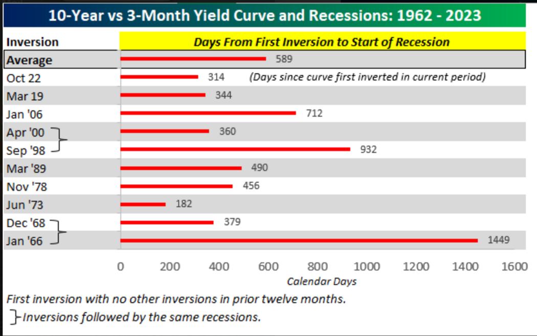Bespoke团队在一份相关客户报告中表示:“在这个周期中,很容易忽视债券收益曲线,但历史表明,衰退并没有在债券收益曲线首次倒挂后迅速到来。”