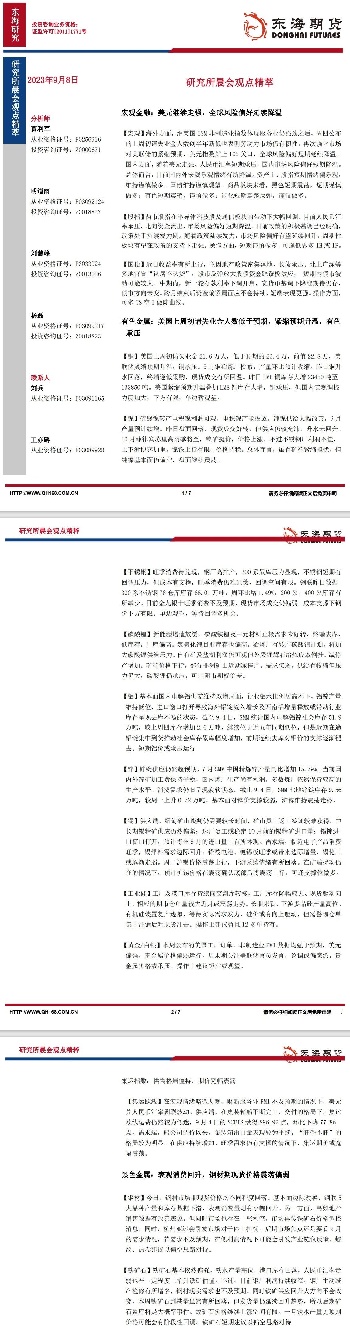 标题:【东海期货9月8日研究所晨会观点精萃】美元继续走强,全球风险偏好延续降温