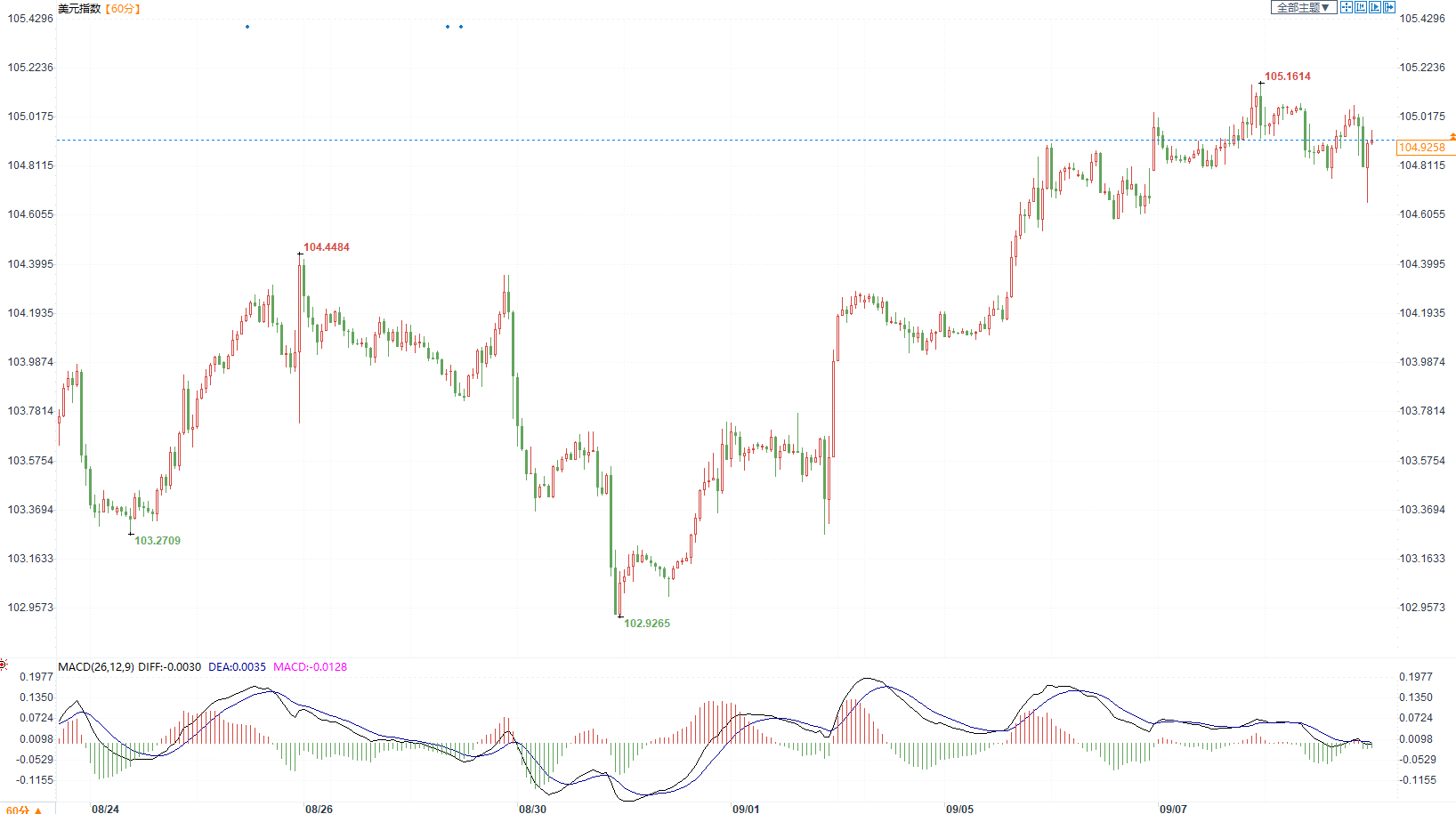 截止发稿,衡量美元兑主要货币的美元指数下跌0.05%,至105,但与前一交易日的六个月高点105.15相距不远。该指数有望连续第八周延续涨幅,迄今为止已上涨0.7%。
