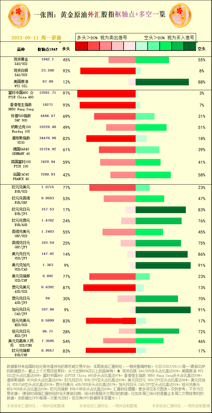 标题:一张图:2023/09/11黄金原油外汇股指"枢纽点+多空占比"一览