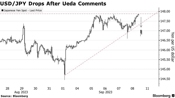 周一(9月11日)亚市盘初,因日本央行行长植田和男释放可能结束负利率的重磅信号,日元兑主要货币全线走强,美元/日元大幅跳空低开超过80点。