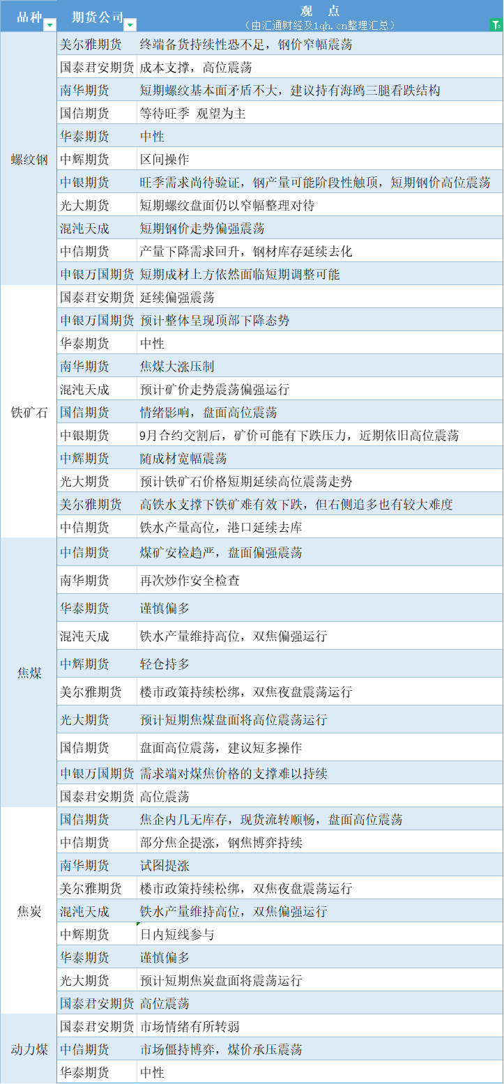 汇通财经APP讯——期货公司观点汇总一张图:9月13日黑色系(螺纹钢、焦煤、焦炭、铁矿石、动力煤等)