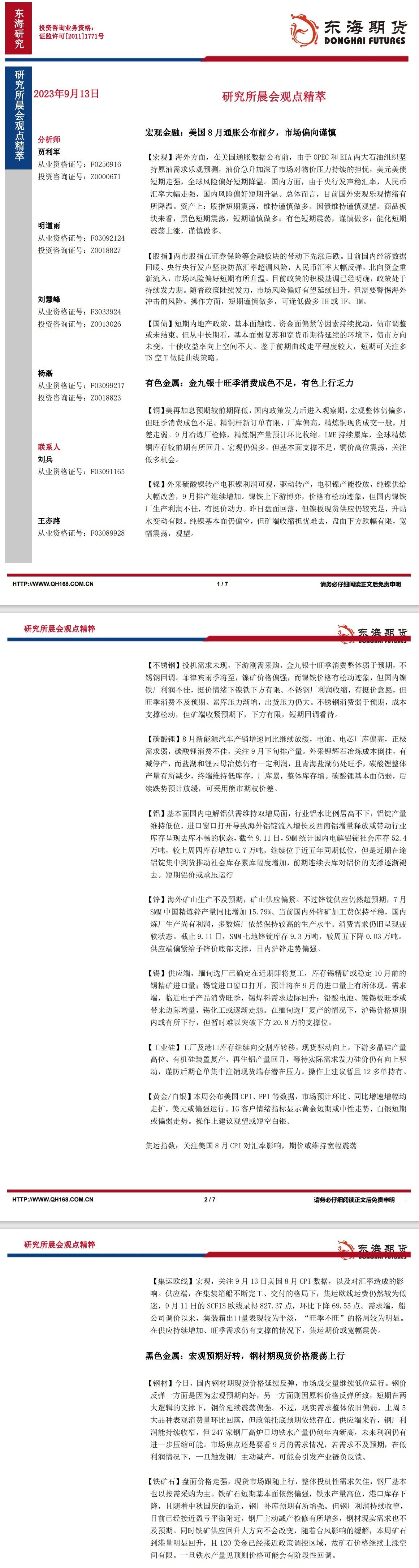 标题:【东海期货9月13日研究所晨会观点精萃】美国8月通胀公布前夕,市场偏向谨慎