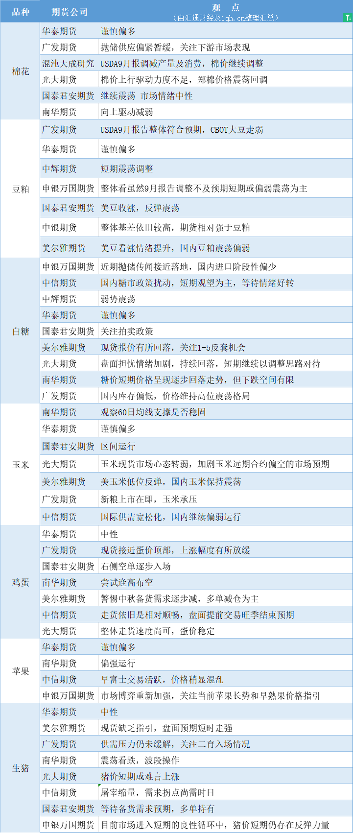 汇通财经APP讯——期货公司观点汇总一张图:9月14日农产品(棉花、豆粕、白糖、玉米、鸡蛋、生猪等)